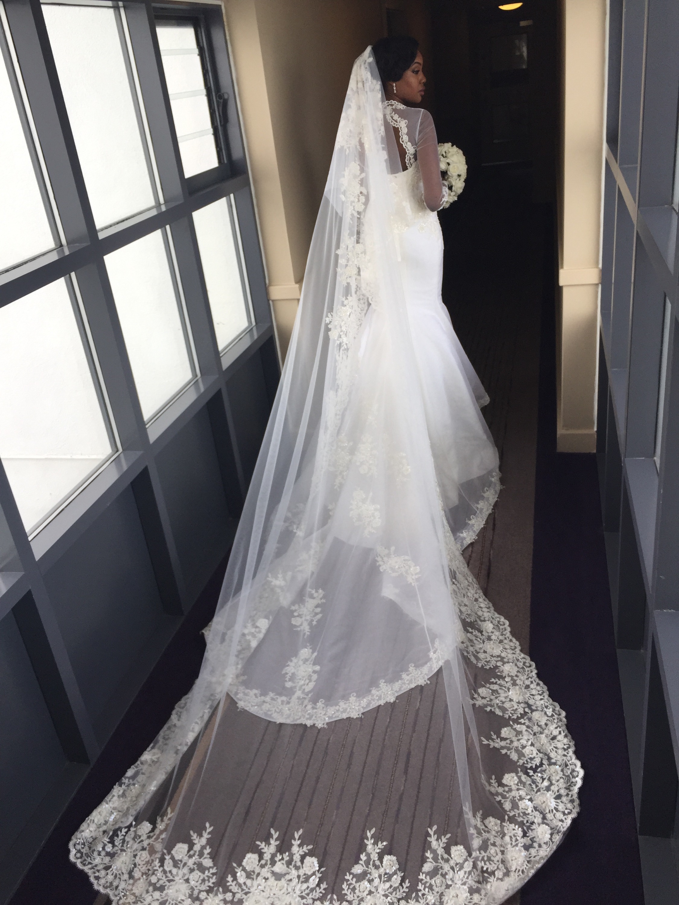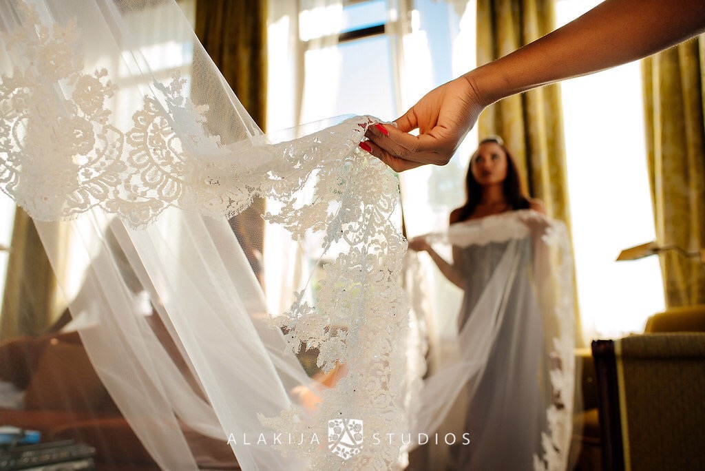 Layal wore a couture bridal gown with a fitted beaded Lace bodice with an intergral corset and delicate covered buttons over the dress zipper and dropped shoulder strap sleeves. The fishtail skirt was made up of over 50 meters of Tulle gathered into rose swirls and ruffles on the surface fabric of Duchesse Satin. A matching cathedral veil with hand stitched Lace edging completed the ensemble. Photos by Jide Alakija.