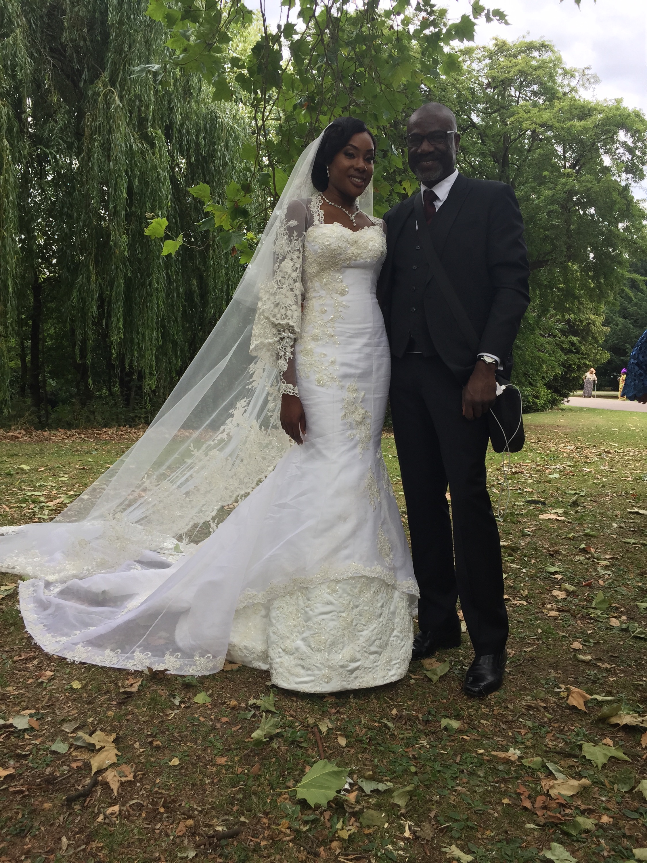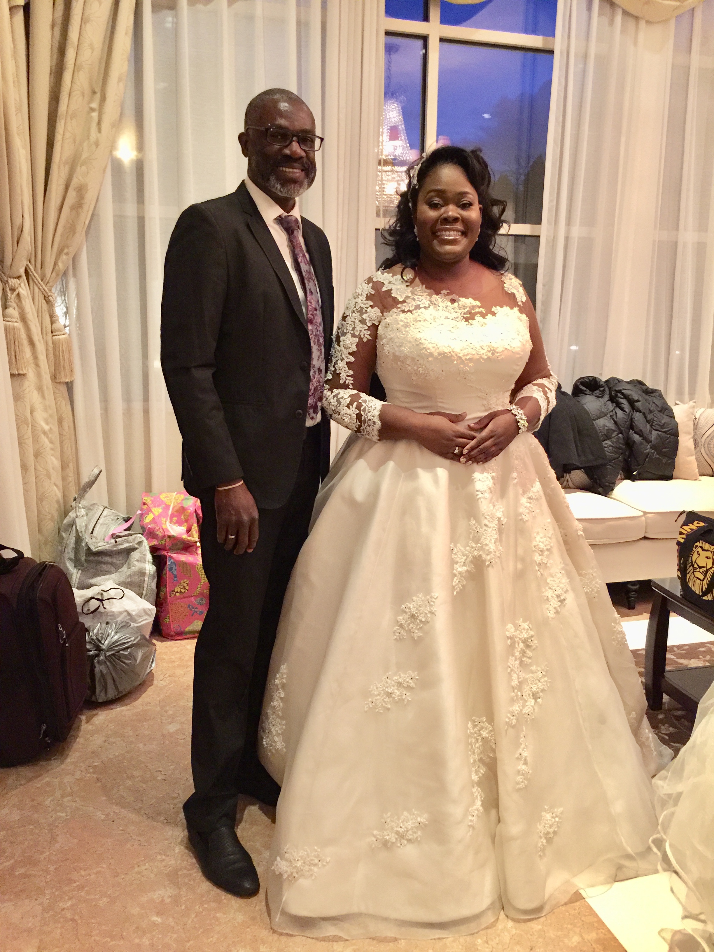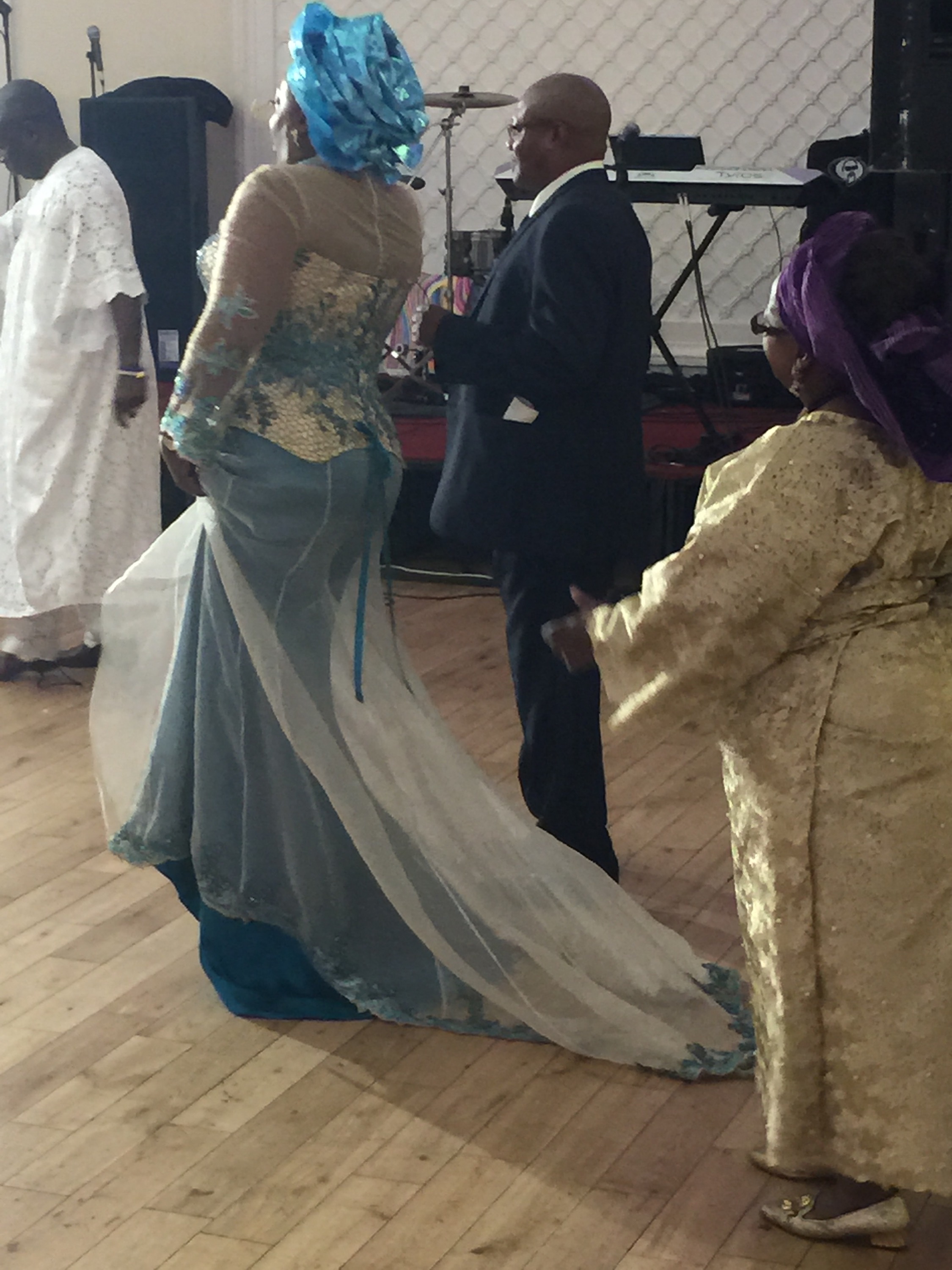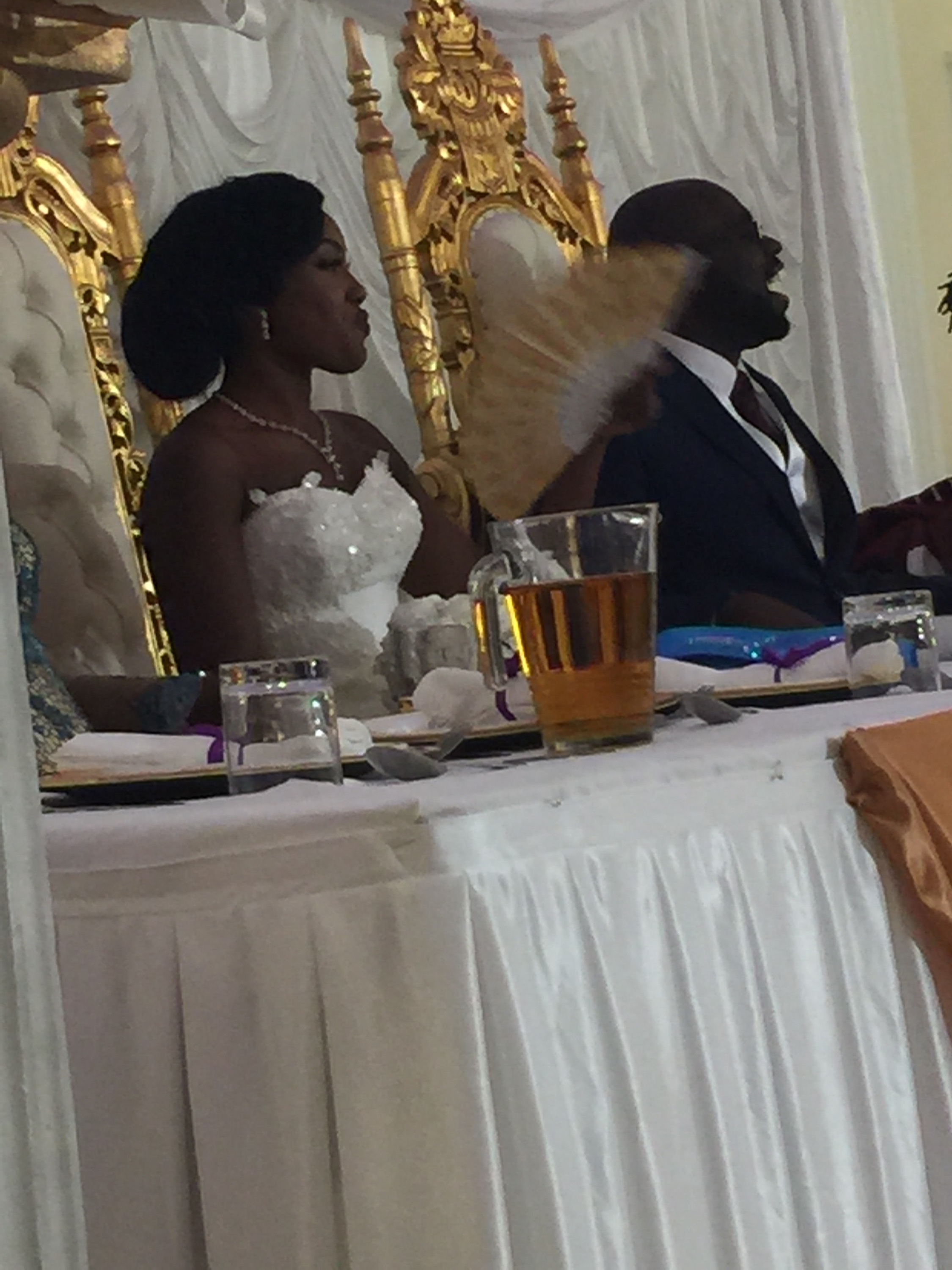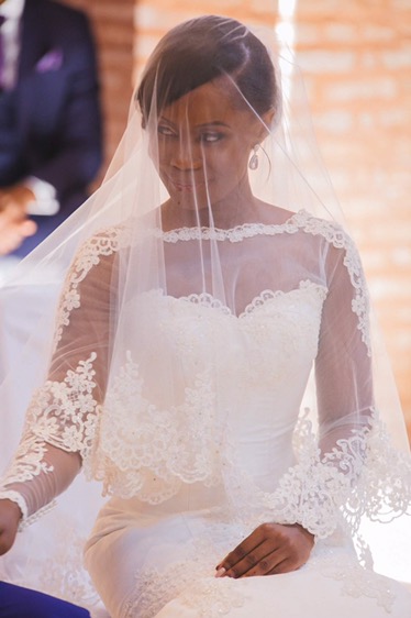 Funmilayo wore a couture fishtail gown. It had a removable chemise with 3/4 length sleeves which she removed for the informal part of the wedding reception.