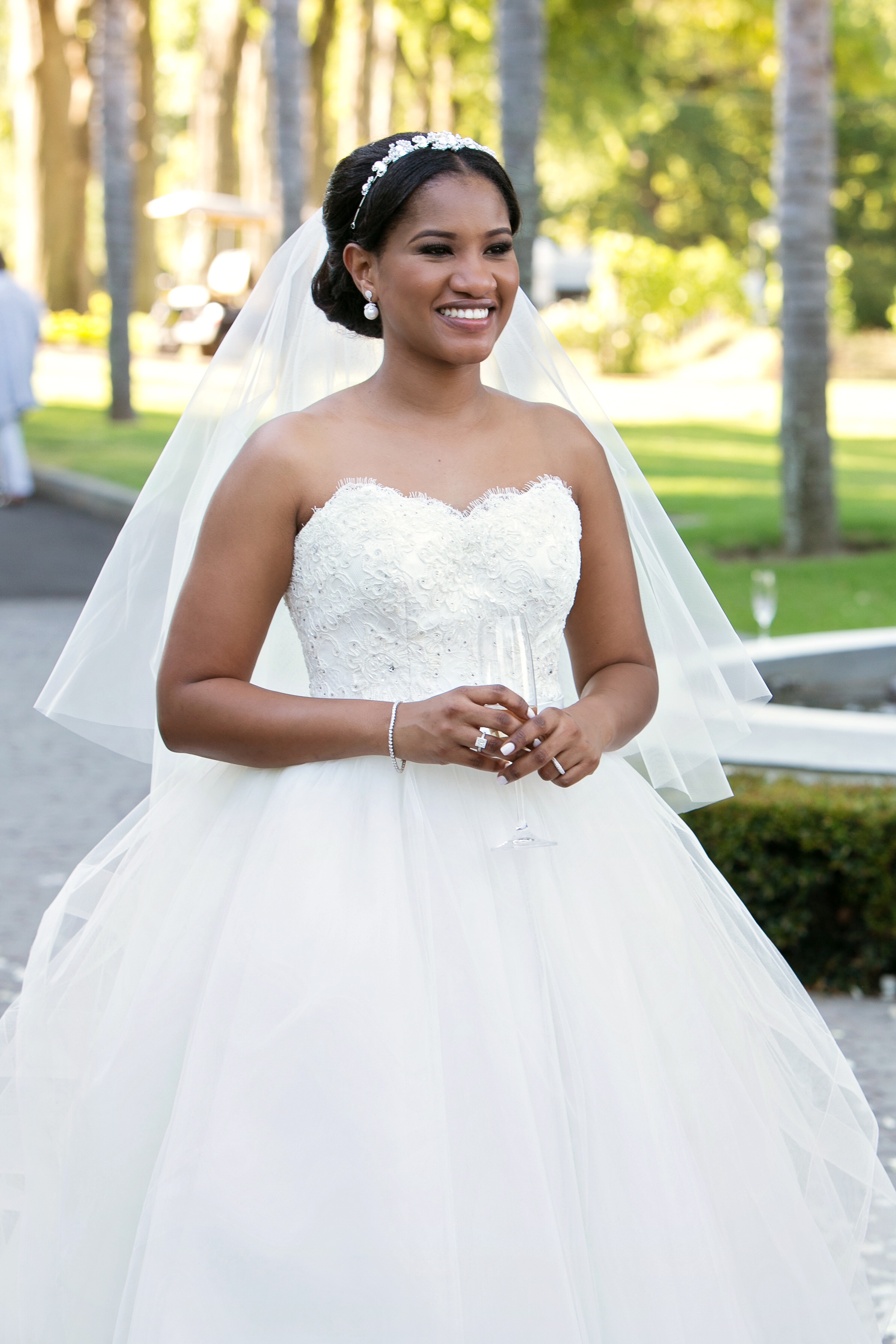 Julianna wore a couture bridal gown featuring an illusion tulle bodice embellished with Lace appliqués and a modified fishtail skirt in soft tulle with a cathedral train.