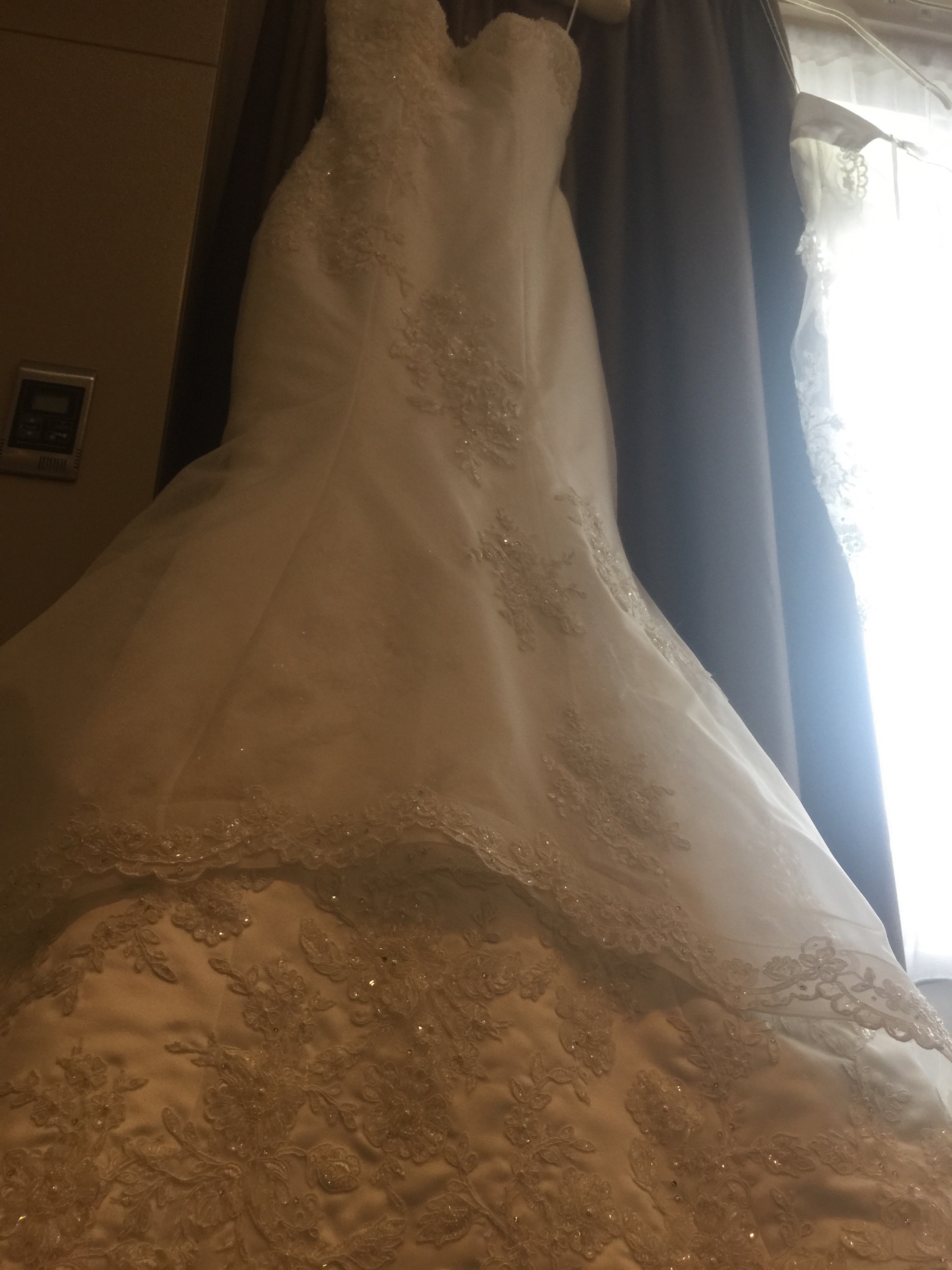 The fishtail gown features a pearl and diamanté embellished neckline and waistline. The skirt is sprinkled with hand-cut Swaroski diamanté encrusted Lace appliqués hand sewn into place.