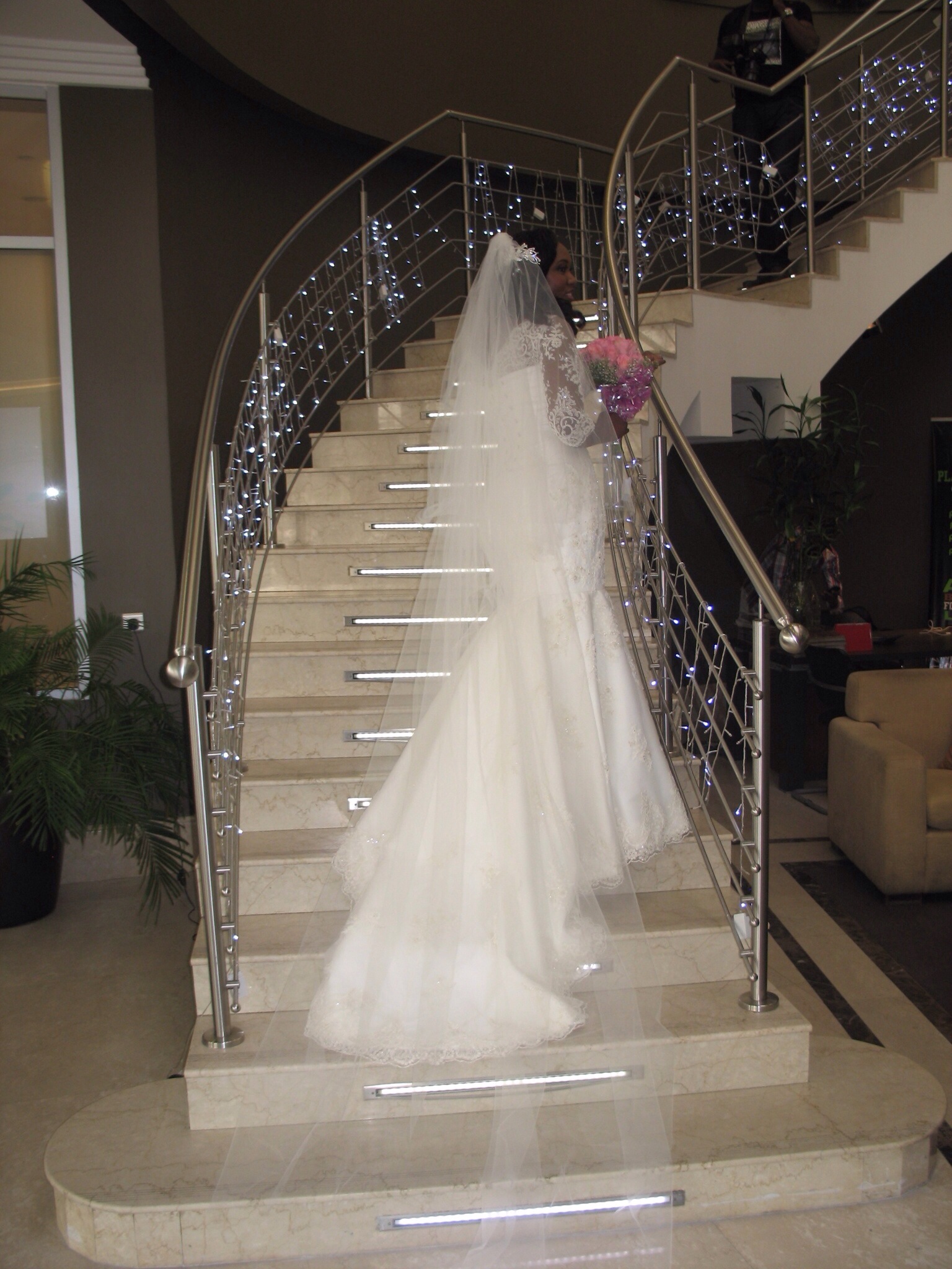 Layal wore a couture bridal gown with a fitted beaded Lace bodice with an intergral corset and delicate covered buttons over the dress zipper and dropped shoulder strap sleeves. The fishtail skirt was made up of over 50 meters of Tulle gathered into rose swirls and ruffles on the surface fabric of Duchesse Satin. A matching cathedral veil with hand stitched Lace edging completed the ensemble. Photos by Jide Alakija.